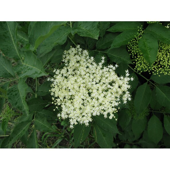 Foto von einer Packung Holunderblüten Tee. Auf der Packung ist eine Abbildung von Holunderblüten.