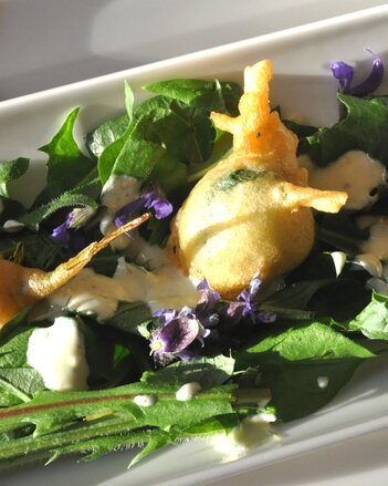 Für das Dressing alle angegebenen Zutaten vermengen und die gewaschenen und gezupften Wildkräuter damit marinieren. Die frittierten Bällchen auf dem Wildkräutersalat servieren. Zart mit Gute Laune Gewürzblüten dekorieren.