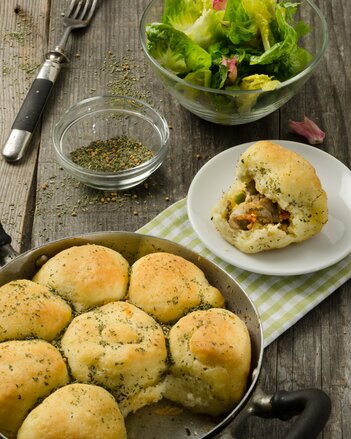 Den Kartoffelteig auf einer bemehlten Fläche zu einer zirka 4 cm dicken Rolle formen und in 2 cm lange Stücke teilen. Die Stücke flach drücken und etwas Fülle in der Mitte platzieren. Den Teigrand darüber schlagen und den oberen Rand in die flüssige Butter tauchen